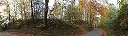 The earthwork is a motte-and-bailey castle built during the mediaeval period, consisting of a roughly-rectangular enclosure, 26 metres northwest-to-southeast by 18 metres. The mound is at the northeast of the enclosure, right by the road which follows a historical defensive ditch. The site appears to have been reduced in size by landslips on the sharply-dropping western side. The circular motte is steep, approximately 3 metres high and 7 metres in diameter. One source considers the motte as the remains of a late cutting through a partial and damaged ringwork, i.e. not defensive and with an unclear purpose.[3] South of it is an approximately 2.5-metre-high bank which ends just before the edge of the slope, possibly indicating the entrance. There is a ditch on the south side of the slope approximately 2 metres wide and deep.[3][4]
