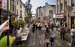 Historically known as an actors' and artists' quarter, it has a sizeable LGBT community and a network of streets with specialised shops, hotels, cafés and pubs. The annual Brighton Pride Village Party takes place in the western part of Kemptown closing off parts of St James' Street, Marine Parade and surrounding streets.[6]