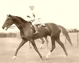 He was an attractive chestnut stallion, foaled in 1914, by Ksar’s half-brother, Kenilworth (FR), his dam Calluna was by Manton (NZ). Kenilworth won the Prix Greffulhe, Prix Rainbow and the marathon four miles (6,400 metres) race, Prix Gladiateur before being exported to Australia.[1] In Australia Kenilworth was the sire of 15 stakes winners that won 36 stakes races, including Wolaroi, which had 12 stakes wins.[2] Kennaquhair was a brother to Kenaluna, dam of Red Thespian (NJC Cameron Handicap). They were closely related to Blue Spec and Eric, won the AJC Metropolitan Handicap etc.[3]