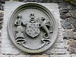 A finely carved coat of arms of the Kennedys of Bargany and Ardstinchar is displayed above the entrance door. They are Quarterly, 1st and 4th, argent. a chev. gules between three cross crosslets fitchée ea., for Kennedy; 2nd and 3rd, azure three fleurs-de-lis or, the arms of France. The supporters are Joan of Arc due to Hugh Kennedy's link with her from the Hundred Years' War and a Wyvern.[19] The arms of France were granted by Charles VII for services rendered.[12][21]