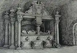 As stated, four stone slabs below the figures with the four extended trusses could be pulled out to give access to the crypt below.[2] These four rectangular stone slabs are still present, set within the smaller stone slabs that pave the floor of the aisle. It is not known when the crypt was last used or if it contains other burials than Gilbert, Jean and their three children.