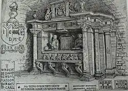 The mural monument architecturally has much in common with the 1600 Glencairn Monument commissioned by James, Seventh Earl of Glencairn for himself, his Countess, Margaret and their eight children. A burial crypt was present in front of the monument.[4]