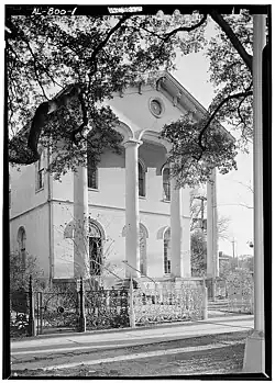 Brick with stucco scored to simulate ashlar, rectangular (three-bay front) with long offset rear wing, two stories, gable roof with single cross-gable, wide bracketed eaves, full-height pedimented four-column portico reflecting transition between Classic Revival and Italianate, arched openings with hood molds, bay window on W side, L-shaped wooden gallery in rear; side hall plan, ornate interior woodwork, curved stair with statuary niche, denticulated plaster cornice; notable cast-iron fence. Built 1857 for wealthy local merchant; later Seamen's Bethel; American Legion headquarters since 1947; later addition to rear wing. Outstanding local example of late ante-bellum architectural eclecticism, 4 ext. photos (1963), 2 int. photos (1963).[3][4]