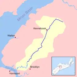 The village of Kennetcook takes its name from the river, which is a Mi'kmaq word meaning "the place ahead".[4] It was known to the Acadians as Quenetcou.[5] A covered bridge over the river in Kennetcook was the last in Nova Scotia. It was replaced in 1967.