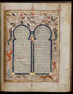 The Kennicott Bible (Galician: Biblia Kennicott or Biblia de Kennicott), also known as the First Kennicott Bible,[1] is an illuminated manuscript copy of the Hebrew Bible, copied in the city of A Coruña in 1476[2] by the calligrapher Moses ibn Zabarah and illuminated by Joseph ibn Hayyim. This manuscript is considered by some, such as the historian Carlos Barros Guimeráns, to be the most important religious manuscript of medieval Galicia.[3] It is also regarded as one of the most exquisite illuminated manuscripts in Hebrew in an article published by the Library of the University of Santiago de Compostela,[2] and the most lavishly illuminated Sephardic manuscript of the 15th century by Katrin Kogman-Appel.[4]