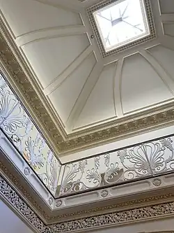 By the early 1850s, Matthew hired Edward Culliatt Jones (1822–1902) and Francis D. Lee (1826–1885) of Charleston to design Kensington Mansion using architectural elements from the Louvre and Palace of Fontainebleau in France as inspiration. Between 1851 and 1854, many skilled laborers enslaved by the Singletons planed the cypress and pine lumber, shaped the bricks, mixed the plaster, and forged the ironwork used in the mansion's construction.[17][18] Predating the emergence of the Second Empire style in the 1870s, the resulting three-story structure, completed in 1853, consists of a cruciform floorplan, 29 rooms, and12,000 square feet. Built on a raised brick basement, the house is made of wood and capped with a domed copper roof. The exterior includes a three-part porte-cochere with modified Corinthian arches and pilasters that feature goat heads. Inside, intricate plasterwork and cast-iron railings culminate in a glass sky light in the domed ceiling.[19][20][21]