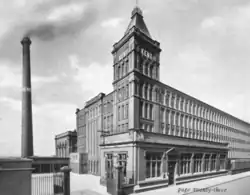 It was in the second half of the 19th century, that Oldham became the world centre for spinning cotton yarn.[6] This was due in a large part to the formation of limited liability companies known as Oldham Limiteds. In 1851, over 30% of Oldham's population was employed within the textile sector, compared to 5% across Great Britain.[7] At its zenith, it was the most productive cotton spinning mill town in the world.[8][9] By 1871 Oldham had more spindles than any country in the world except the United States, and in 1909, was spinning more cotton than France and Germany combined.[10] By 1911 there were 16.4 million spindles in Oldham, compared with a total of 58 million in the United Kingdom and 143.5 million in the world; in 1928, with the construction of the UK's largest textile factory Oldham reached its manufacturing zenith.[6] At its peak, there were over 360 mills, operating night and day;[11][12] Kent Mill was built in 1908 by Kent Mill Ltd.