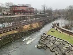 Through downtown Kent, the B&O tracks are just west of the Erie tracks, between the Erie rails and the Cuyahoga River on a lower level closer to the river. The B&O line was originally built in the 1880s by the Pittsburgh and Western Railroad after the Erie line had been established, and is known to locals as the "lower tracks". Kent's first B&O station was a box car located adjacent to the south side of the Main Street Bridge just below the Erie depot. This depot was accessible from the bridge using a staircase and a luggage ramp.[18] In 1905, as part of a larger project to double-track the line, the B&O opened a new station a short distance to the south at Summit Street. This station consisted of a makeshift platform along the lower tracks extending northward from Summit Street and a small wood-frame building with a ticket window near the south end. On the south side of the street was the accompanying freight depot. B&O trains traveling between Chicago's Grand Central Station and Pittsburgh's P&LE Station could stop at Kent, but the stop was a flag stop only available on certain trains.[19] Passenger service to this station ended April 30, 1971. The passenger depot, owned by B&O successor CSX Transportation, still exists as of 2023, though it was damaged by fire in 2013. Its accompanying freight depot was razed in 2010.[20]