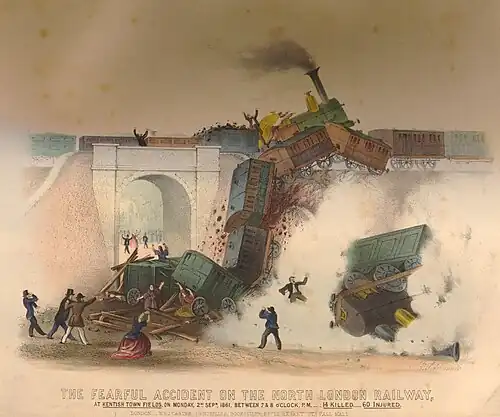 On 2 September 1861, near Kentish Town station in London, 16 people were killed and 317 were injured when an excursion train operated by the North London Railway collided with a freight train operated by the London and North Western Railway.[1]