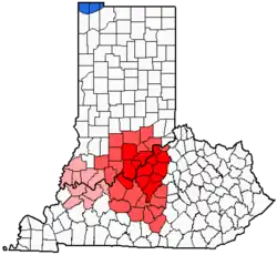 The original meaning of the term Kentuckiana dates back to the 19th century as a collection of items from or relating to Kentucky.[2] The modern meaning of term as a geographical area was coined by The Louisville Courier-Journal and The Louisville Times sometime during the 1930s.[3] This second definition originally referred to only Jefferson County, Kentucky and Clark and Floyd Counties in Indiana- this referring to the geographic center of the Louisville metropolitan area. Since the 1980s the term has expanded to include more counties on both sides of the Ohio River.[4] Today it refers to an indefinitely large region where Kentucky and Indiana meet,[2] usually centered on Louisville, Kentucky.