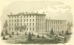 In 1880, the trustees bought the former Danville Classical and Military Institute (now the site of Danville High School).[2] Caldwell Female College reopened at its new location in September 1881. Its campus had limited accommodation for boarding students.[4] It president was Rev. John Montgomery.[2][5] In the 1882–83 school year, the college had 130 students.[6] The college absorbed Bell Seminary, a local girls' school in 1885.[2]