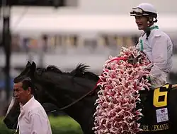 The winner of the Kentucky Oaks is also presented with a garland of lilies draped around the filly's withers.