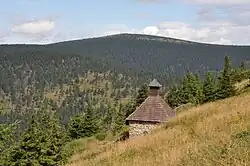 The summit of the mountain is on an exposed rocky outcrop about 20 m in length, which serves as a scenic viewpoint.[8] From there, expansive views can be seen,[13] including the peaks of Černava, Šerák, Šumný, Červená hora, and Troják, as well as distant mountain ranges such as the Giant Mountains with Sněžka, the Králický Sněžník Mountains, the Beskids, the Malá Fatra, and even the Slovak Tatras.[14] Additionally, a small conical monument called Kámen with a worn commemorative inscription is located on this rocky outcrop:[15]
