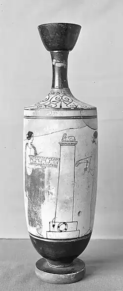The Kerameikos steles are a collection of sculptures used as grave-markers (steles, sing. stele) in the Kerameikos necropolis of Attica. Kerameikos is located outside the Themistoclean Wall's Dipylon Gate. Stelai come in various shapes/designs and depict images varying from pottery to narrative scenes. They were often marble or limestone, and were carved or sculpted to depict the person being memorialized sometimes with relatives or slaves. Reliefs decorating the graves were meant to show the dead in their best light, using imagery to recognize their bravery in battle, or pathos, or wealth. These monuments marked the graves of Athenian men, fallen warriors, as well as non-citizens.[1] Women were also included in Kerameikos but typically it was the wealthiest or prominent women who were given stele.[2] In many vase paintings of grave scenes wreaths are seen resting at the base of stele. This was likely a popular way to adorn the graves of loved ones.