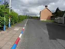Kerb painting is used in Northern Ireland by members of the unionist and nationalist communities. It is used to mark territories and boundaries and declare the sectarian affiliations of residents, in a similar fashion to sectarian murals.[1][2][3] Street lights, litter bins and roundabout chevron stones have also been painted.[4] Unionists use the colours of red, white and blue from the British Union flag, and nationalists the green, white and orange of the Irish tricolour.[3]