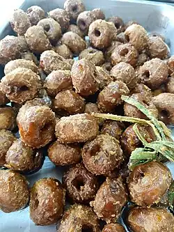 Keria Gula Melaka is a type of doughnut that is made of sweet potato and topped with smoky gula Melaka, which is a type of Malaysian coconut palm sugar.[1]