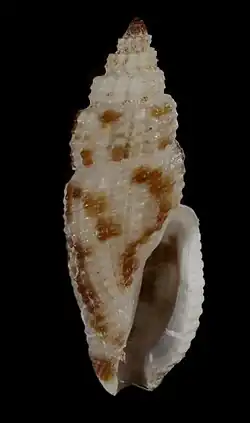 The shell is decussated by longitudinal and revolving sculpture. It is yellowish white, with chestnut short longitudinal strigations upon the granules, often upon every alternate rib, interrupted by a central white space, and again painted towards the base. Sometimes this coloring is broken up and more or less dispersed over the surface.[2]