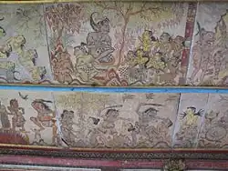 The upper panels depict scenes from a section of the Hindu epic Mahabharata, called Bhima Swarga story. Some of the lower panels show scenes from the Tantri narrative; others illustrate the story of the bird-god Garuda in his quest for the water of immortality. Other lower panels show the earthquake calendar, with scenes predicting the portents of earthquakes (Palindon).[7]
