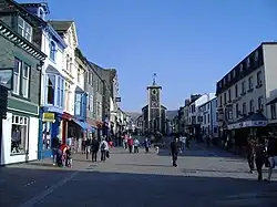 Keswick was granted a charter for a market in 1276 by Edward I. This market has an uninterrupted history lasting for more than 700 years.[22] The pattern of buildings around the market square remained broadly the same from this period until at least the late 18th century, with houses – originally timber-framed – fronting the square, and sturdily enclosed gardens or yards at the back. According to local tradition these stout walls and the narrow entrances to the yards were for defence against marauding Scots. In the event it appears that the town escaped such attacks, Scottish raiders finding richer and more accessible targets at Carlisle and the fertile Eden Valley, well to the north of Keswick.[23]