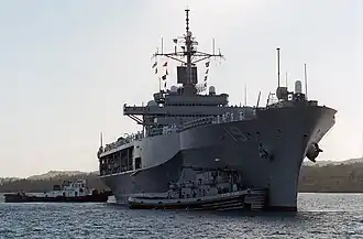 ![]() A starboard bow view of USS Blue Ridge (LCC-19) being assisted by Ketchikan (YTB-795) and another tug, while docking at Sierra Pier, Naval Station Guam during Exercise TANDEM THRUST '99.