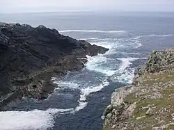 Kettla Ness, Kettlaness or just Kettla is a tied island and headland in Shetland.[4] It is connected by the tombolo Minn beach (Banna Minn), to the south end of West Burra, part of the Scalloway Islands.[5][6] The headland itself is conspicuous and circa 160 feet high.[7][8] The island is accessible to walkers via Minn beach and is now uninhabitated.[7] It is principally used for Sheep farming and pasture.[6]