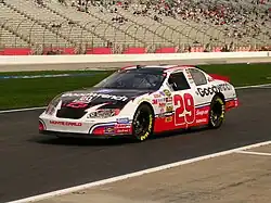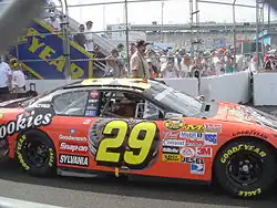 On August 28 during the 2004 Sharpie 500 at Bristol Motor Speedway, Harvick had one of the most bizarre sequences of events happen to him. On lap 323, Harvick radioed to his crew that his right arm had fallen asleep on him and had gone numb which made it difficult for him to operate his race car properly and needed a backup driver. The caution came out five laps later and Harvick made his way onto pit road and was pulled out of the car. He was replaced by Kyle Petty, who was involved in an earlier wreck in the same race. Petty finished six laps down in 24th for Harvick.[11] Harvick was still able to stay 8th in points but in the last 2 regular season races at California and Richmond, Harvick would finish in 28th and twelfth causing Harvick to fall from eighth to fifteenth in the standings missing out on the inaugural Chase for the Cup. Harvick's season was also known for his conflicts with Matt Kenseth at Pocono and rookie Kasey Kahne at Phoenix.[12][13] While winless in the 2004 Cup season, Harvick placed third in the voting for Most Popular Driver. He had fourteen top-ten finishes and finished fourteenth in points. Harvick was paired with another driver in the Busch Series, rookie Clint Bowyer. They combined for one win, thirteen top-fives, and twenty top-tens in the No. 21 car, with Reese's Peanut Butter Cups as a sponsor. Harvick drove the No. 29 Busch car in the final race of the season at Homestead–Miami Speedway in the Ford 300, which he would claim his second win of the season. He finished 14th in the final standings. The No. 21 car finished fourth in the owner's standings.