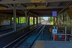 In November 1963, the LIRR announced a plan to shorten the platforms at Forest Hills and Kew Gardens by 300 feet (91 m). The railroad's justification was that ridership at the stations was low, and did not warrant repairing the crumbling concrete. These sections of platforms had been installed in about 1929 to allow the stations to accommodate full-length trains. This move was opposed by civic groups, and resulted in an investigation by the Public Service Commission.[74] However, the platform extensions were removed by March 1964.[75] Prior to their removal, the platforms extended to the overpass at 82nd Avenue (formerly known as Onslow Place).[28]: 56  A staircase from each platform allowed passengers to enter and leave the station from its western end.[29][76][77][78] The eastbound platform used to have a waiting room, but it was removed in the late 1970s.[28]: 42  In the early 1990s, the westbound platform was extended by about 200 feet (61 m), doubling the number of cars that could platform at the station to four.[79]