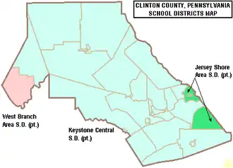 The Keystone Central School District (KCSD) is a midsized rural, public school district based in Lock Haven, Pennsylvania, that includes public schools in Clinton County, and that serves students in Clinton County, Centre County, and Potter County. It encompasses approximately 1,048 square miles (2,710 km2) square miles, making it the largest public school district by land area in Pennsylvania. According to 2000 federal census data, it served a resident population of 36,950. By 2010, the district's population was 37,794 people,[1] making it a district of the third class. The educational attainment levels for the school district population (25 years old and over) were 85.7% high school graduates and 17.2% college graduates.[2] The district is one of the 500 public school districts of Pennsylvania.