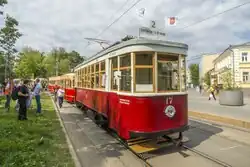 Kh (Russian: Х) was the class of double axled high-floor tramcars, which were built in Soviet Union in interbellum period. First vehicles were built in 1927 and delivered to Kharkov, Ukraine. First letter of city name, Cyrillic Х (usually transliterated as Kh), was selected as a designation of whole series. After Kharkiv, tramcars of this type were supplied to many Soviet cities and became most numerous in the fleets of many municipalities. In 1941, after the onset of Operation Barbarossa, their production was stopped for maximizing war efforts. The Kh-class tramcars were finally withdrawn from the city service in the mid-1960s as they had become operationally obsolete; their sturdy construction would have allowed them to be used much longer, but tram systems preferred more modern, better riding, newer trams. A small number of surviving cars are preserved for museum purposes in Moscow, Nizhniy Novgorod, Saratov and a few other cities.
