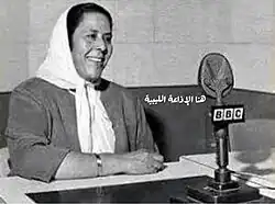 After al-Jahamī's graduation, she returned to Benghazi in October 1956 to join work as a broadcaster at Radio Benghazi.[6] She became the second female Libyan broadcaster, after Hamida Abu Amer.[6] She later moved to Tripoli to continue her journalism.[5] She was sent on a 100-day training course where she met Tunisian President Habib Bourguiba.[5] Through her work with "The Audible Theatre" programme, she performed many radio dramas, as well as presenting dozens of radio programmes, many of which focussed on health, children and Arab artists, amongst many other themes.[5] These dramas were vital in enabling women's issues in particular to be brought to a wider audience.[2]