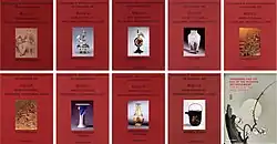 The collection includes metalwork, enamels, ceramics, and lacquered objects, including works by artists of the imperial court that were exhibited at the Great Exhibitions of the late 19th century.[11] With more than 1,400 objects in total,[17] it is comparable only to the collection of the Japanese imperial family in terms of size and quality.[18] The collection catalogue published in 1995, Meiji No Takara, runs to eight volumes.[19] Rather than covering the whole range of Meiji-era decorative art, Khalili has focused on objects of the highest technical and artistic quality.[20] Twenty-five of the objects have emblems showing that they were commissioned by the Emperor as gifts for foreign dignitaries and royalty.[21] Another twelve were made for international exhibitions around the turn of the 20th century.[21]