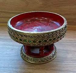 A khantoke or khantok (Thai: ขันโตก, pronounced [kʰǎn.tòːk]; Lao: ພາໂຕກ, pronounced [pʰáː.tȍːk]; Northeastern Thai: พาโตก, pronounced [pʰâː.tòːk]) is a pedestal tray used as a small dining table by the Lanna people (of northern Thailand), Laotians, and by people from Isan (northeastern Thailand).[1] A khantoke tray is a short, round table, made of several different materials such as: wood, bamboo or rattan. It has a diameter of about 35 centimetres (14 in) but can vary in size and use case. It is comparable to the daunglan traditionally used in Burmese cuisine.