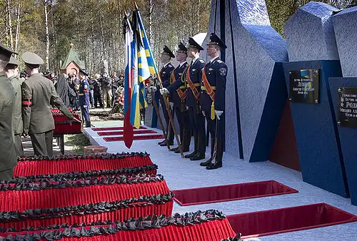 On 6 May 2007, the major TV channels of Russia showed the footage of the reburial of the exhumed remains at the Novoluzhinskoe cemetery, located in the centre of the city.[15] The solemn ceremony was attended by about 1,000 people, including many veterans. An armoured carrier led the funerary procession. "The fallen heroes were remembered with a triple gun salvo from a Moscow Military District regiment."[2][16]
