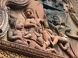 Khmer sculpture (Khmer: ចម្លាក់ខ្មែរ, Châmleăk Khmêr [cɑmˈlak kʰmae]) is the stone sculpture of the Khmer Empire, which ruled a territory based on modern Cambodia, but rather larger, from the 9th to the 13th century. The most celebrated examples are found in Angkor, which served as the seat of the empire.