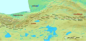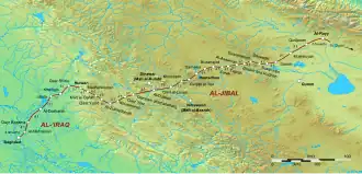 The first settlement after Baghdad was Nahrawan or Jisr Nahrawan ("Bridge of Nahrawan"), named after the great Nahrawan Canal which passed through it. In the Abbasid period it was prosperous, but was abandoned and fell in ruin when the road moved north to Ba'quba. The surrounding district was known as Ṭarīq-i-Khurāsān after the Khurasan Road.[7] The next town was known in Arabic as Daskarah al-Malik ("Daskara of the King"), and is identified with Sassanian-era Dastagird. Then followed Jalula, near which a large Sasanian-era bridge crossed the Diyala River, and Khaniqin, also the site of a major bridge, and Qasr Sjirin, the "Castle of Shirin", named after the wife of the Sasanian shah Khosrow II.[8] At Hulwan, the road left the Mesopotamian plain and entered the Zagros Mountains and the province of Jibal.[9] The road continued to Madharustan and finally exited the Hulwan pass at the town of Kirind and the village of Khushan. Then followed Tazar or Qasr Yazid and al-Zubaydiya, where the road turned east towards Kirmanshah across the plain of Mayidasht or Mahidasht. On most of these localities, the Muslim geographers record the presence of remnants of Sasanian palaces.[10] From Kirmanshah the road continued to Hamadan and Sivah, turned north to Rayy, and from there passed east into the province of Qumis.[11] The road was the main lifeline of Qumis, and most of the province's towns were located along its course: Khuwar, Qasr or Qariyat al-Milh (the "Salt Castle"), Ras al-Kalb ("Dog's Head", identifiable with Lasgird), Samnan, Damghan, al-Haddadah ("the Forge") or Mihman-Dust, and Bistam. Near Bistam, at the village of Badhash, the road entered Khurasan.[12]