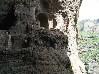Kakavaberd / Geghayo, Keghayo, Geghi, Keghi fortress, Tatul fortress / are brilliant fort-construction models of historical Armenia. It is located 12 km to the south-east from Garni, on the right bank of Azat river. The fortress now exists and is quite well preserved. It is inaccessible from three sides as it was surrounded by natural gulfs (abysses / precipices) and huge rocks. The forth side is fenced / enclosed as it was not protected by natural barriers. The walls / fences prolonged to the north-east have 2–2.5 meters thickness, near the gate the thickness is 2.60 m. The height of the walls is 8.15 m. The northern towers are eight and their height is more than 10 meters. There are anterooms at the bottom of some towers, as well as there is a round room and small windows inside some of the towers. There is a chapel dug / carved out of the rock with a cross carved on the front at the entrance near the gate of the fortress. The citadel is situated on the western side of the fortress. There are noticeable building ruins, too. The fortress took the name "Kakavaberd" as there are numerous partridges / willow ptarmigans thereabout; the original name was "Geghama Monastery" after the name of the highland. Kakavaberd is also called Tatul fortress, as it is very similar to Tmkaberd in Javakhq. Hovhannes Draskhanakerttsi (9–10 centuries) was the first to mention about the fortress during the description of the retreat of Arab general / military leader Bsheri who was defeated during the sea battle in Sevan by Ashot Erkat /Iron/ Bagratuni. In the 11th century the fort was owned by the Pahlavunis and in the 12–13th centuries the Proshyans were the rulers here. Later on, Stephanos Orbelyan left a written memoire about the fort giving Geghi name to the fort where he described the battle held near Garni village/city in 1225. There is no precise data on the foundation and destruction of Kakavaberd fort. It was probably destroyed in 1679 from the earthquake after which it was not reconstructed.[18]