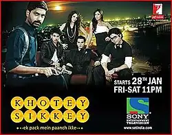 Khotey Sikkey (transl.Fake Coins) is a crime television series that aired on Sony TV. It premiered on 28 January 2011. The show revolves around an unlikely gang of five privileged youngsters and one stubborn cop. The group researches the crime activities in Mumbai.[1] The series produced by Yash Raj Films.