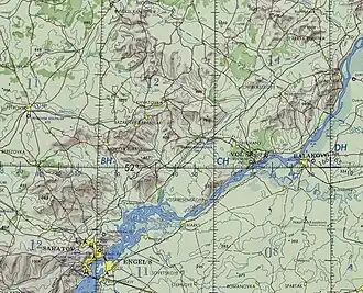 The Khvalynsk Mountains are a group of smooth hills in the East European Plain, extending on the right bank of the Volga. They are one of the highest of the subranges of the Volga Uplands.[3][2] They are mostly located in the Saratov Oblast, with a small part in southeastern Penza Oblast. The hill zone is sparsely populated. Villages such as Pikhankino (Пиксанкино), Novaya Yaksarka (Новая Яксарка), Staraya Yaksarka (Старая Яксарка), Novy Machim (Новый Мачим), Russkaya Norka (Русская Норка), Mordovskaya Norka (Мордовская Норка), Rango Lisma (Ранго-Лисьма), Vilyayevka (Виляевка), Ivanovka (Ивановка —Шемышейский район), Yango-Prya (Янго-Пря), Ust-Murza (Усть-Мурза), Vorobyovka (Воробьёвка —Шемышейский район), Azrapino (Азрапино —Пензенская область), Naumkino (Наумкино —Пензенская область), Dubrovka-on-Uze (Дубровка-на-Узе), Staroye Zakharkino (Старое Захаркино), Staroye Demkino (Старое Демкино), Ust-Uza (Усть-Уза), Peschanka (Песчанка —Шемышейский район), Aleksandro-Bogdanovka (Александро-Богдановка), Koldais (Колдаис), Neklyudovo (Неклюдово —Пензенская область), Karzhimant (Каржимант), Arapino (Арапино) and Neverkino, are scattered throughout the hill area, but cities are only found in the periphery.