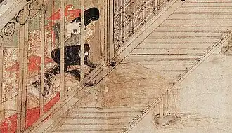 The legend begins with a stranger approaching Haseo to offer him a game of sugoroku, to which he agrees.[36] They arrive in the abode of the latter, Suzakumon, where they make a bet: if the stranger loses, he will present Haseo with an unusual woman, while in the reverse situation Haseo will have to forfeit all of his riches.[41] Haseo soon realizes he is not playing against a human, as the previously disguised stranger gradually reveals his true form as an oni to him due to the stakes of the game making him emotional.[42] He nonetheless eventually manages to win, and the oni introduces him to a young woman, warning him that despite her beauty he needs to be cautious, as it would be unsafe to make love to her sooner than in exactly a hundred days.[43] Haseo at first obeys his instructions, but he grows attached to the woman, and after 80 days he starts to doubt if it is necessary.[44] He embraces her, but she instantly turns into liquid, prompting him to mourn.[45] Three months later Haseo encounters the oni again, but this time he acts hostile towards him, prompting him to call upon the protection of Tenjin,[46] the deified Sugawara no Michizane.[35] The oni is repelled, and the narrator reveals that he regretted entrusting the woman to Haseo and that she was created by him from pieces of corpses and would only gain a soul after 100 days.[46]