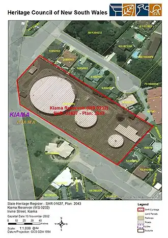 - ^ a b c d e "Kiama Reservoir (WS 0232)". New South Wales State Heritage Register. Department of Planning & Environment. H01627. Retrieved 2 June 2018.