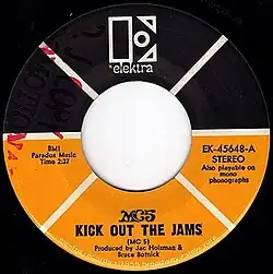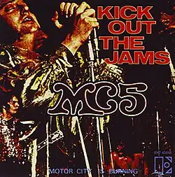 "Kick Out the Jams" is a song by MC5, released as a single in March 1969 by Elektra Records. The album of the same name caused some controversy due to inflammatory liner notes by the band's manager, John Sinclair, and the track's rallying cry of "Kick out the jams, motherfuckers!". According to guitarist Wayne Kramer, the band recorded this as "Kick out the jams, brothers and sisters!" for the single released for radio play; lead vocalist Rob Tyner claimed this was done without group consensus.[6] The edited version also appeared in some LP copies, which also withdrew Sinclair's excitable comments. The album was released in January 1969; reviews were mixed, but the album was relatively successful, quickly selling over 100,000 copies and peaking at #30 on the Billboard album chart in May 1969 during a 23-week stay.