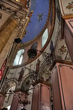 As in most Ethiopian churches, the interior consists of three concentric rings. In the centre is the square mekdes (መቅደስ), "sanctuary", also called the kidist qiddusan (ቅድስተ ቅዱሳን), "Holy of Holies", which only priests and deacons may enter and which contains the tabot, the tablet over which the Eucharist is celebrated. Around this is the circular part known as kidist (ቅድስት), "holy", intended for those able to receive holy communion. The outer circular ring, the qne mahilet (ቅኔ ማሕሌት) is for the cantors and is accessible by the faithful generally.[11][12][13][14]