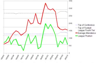 | 2019–20* | National League North | 6 | 33 | 10 | 8 | 15 | 39 | 43 | −4 | 38 | 15th of 22 | Ashley Chambers[78] | 13 | QR2 | - | QR3 | 1,364 |