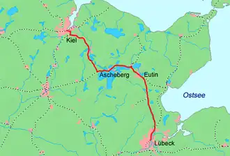 The route runs from Kiel via the towns of Preetz, Plön and Eutin to Lübeck through the Schleswig-Holstein Uplands and, on the Ascheberg–Eutin section, through Holstein Switzerland. This region is characterized by lakes, forests and terminal moraines and is thus an important recreational area.