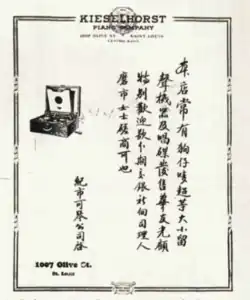 In 1913, the company advertised pianos of its own branding, offering the "Kieselhorst Upright Piano" for $275 ($8,749 today[9]).[10] Other advertisements offered the "Style 90 Kieselhorst Player-Piano" and the "Style 36 Kieselhorst Upright".[11]