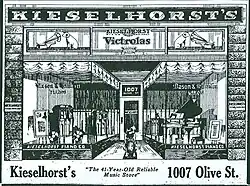 In 1879, Kieselhorst Jr. and Ernst P. Olhausen, who was then the assistant editor of the Westliche Post, opened Olhausen & Kieselhorst, a store that sold "pianos, organs, musical instruments, music, books, and stationery" at 10 South Fourth Street.[2] After six months, Kieselhorst bought out his partner, struck Olhausen's name from the business, and moved the shop to 2706 Laclede Avenue in the Mill Creek Valley neighborhood.[4] In 1881, he began selling Henry Miller Pianos, made in Boston. Three years later, he moved the business to 1111 Olive Street, in the city's growing piano district.[4] He sold pianos by William Knabe & Company (made in New York City), Kimball & Company (Chicago), and Blasius & Sons (Woodbury, New Jersey). By 1893, he was able to move the store to a more prominent space at the southwest comer of Olive and Tenth. Kieselhorst ran the company until 1895, when he died at age 51.[2]