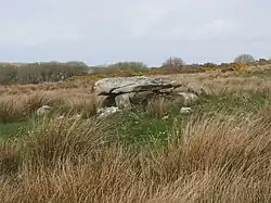 East of the R261 on rough moorland is the larger portal tomb Dg. 70 with two chambers, 9 m apart, and a modern field wall in-between. The north-eastern chamber has a roof stone with a length of 4.2 m which rests on two portal stones, both of 1.8 m height, and a very small pad-stone which in turn rests on the backstone of 1.3 m height. The smaller, south-western chamber has portal stones of 1 m height. The roof stone with a length of 1.9 m is partly dislodged.[5][10] The sill stone between the portal stones has a rectangular piece missing, a feature that is shared with the portal tombs of Poulnabrone, Ballybrittas, and Tawnatruffaun. Most of the stones are from grey granite outcrops in close vicinity to the tomb. The backstone in red Ardara granite stands in a stark contrast to the overall grey, it originates possibly from a cliffy extrusion 200 m south of the tomb.[11]