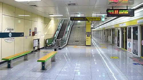 Kim Daejung Convention Center station (Korean: 김대중컨벤션센터역; Hanja: 金大中컨벤션센터驛) is a station of Gwangju Metro Line 1 in Mareuk-dong, Seo-gu District, Gwangju, South Korea. The Gwangju Metropolitan Rapid Transit Corporation is near the station. The station name comes from Kim Daejung Convention Center, which is nearby the station.