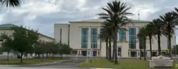 Most of Judge Hammond's career was spent at the Old Flagler County Courthouse, a two-story red brick structure built in 1924. A three-story addition was attached at the rear in 1985, but the main building did not have the technological capacity for the modern legal system. Judge Hammond was instrumental in getting the modern courthouse constructed, and the Kim C. Hammond Justice Center in Bunnell is named in his honor.[8] It was completed and opened in 2007 and is situated adjacent to the new Flagler Government Services Building.[8]