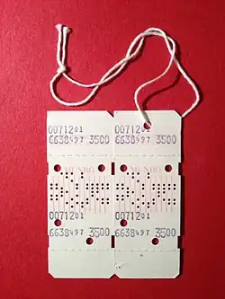 A Kimball tag was a cardboard tag that included both human- and machine-readable data to support punched card processing.[1] A Kimball tag was an early form of stock control label that, like its later successor the barcode, supported back office data processing functions. They were predominantly used by the retail clothing ("fashion") industry.